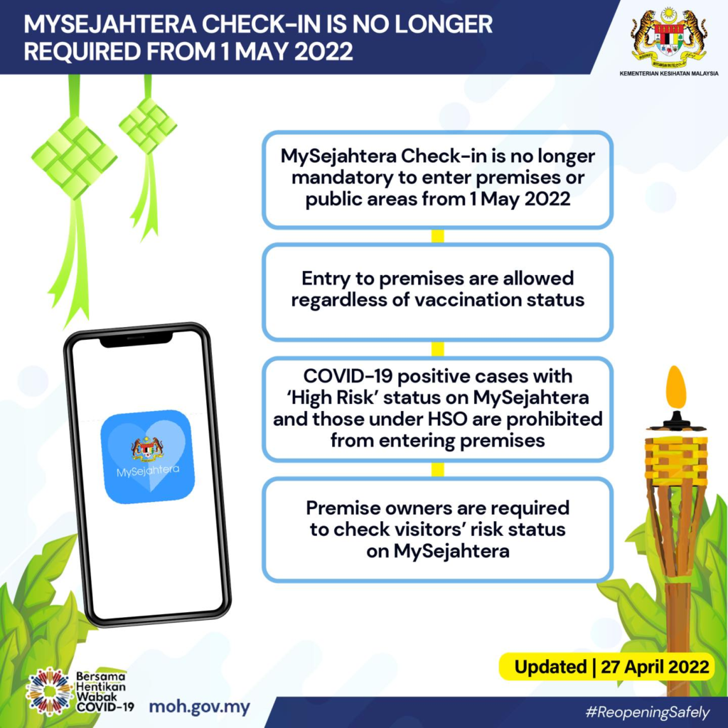 MySejahtera Check-in is no longer mandatory to enter premises or public areas from 1 May 2022